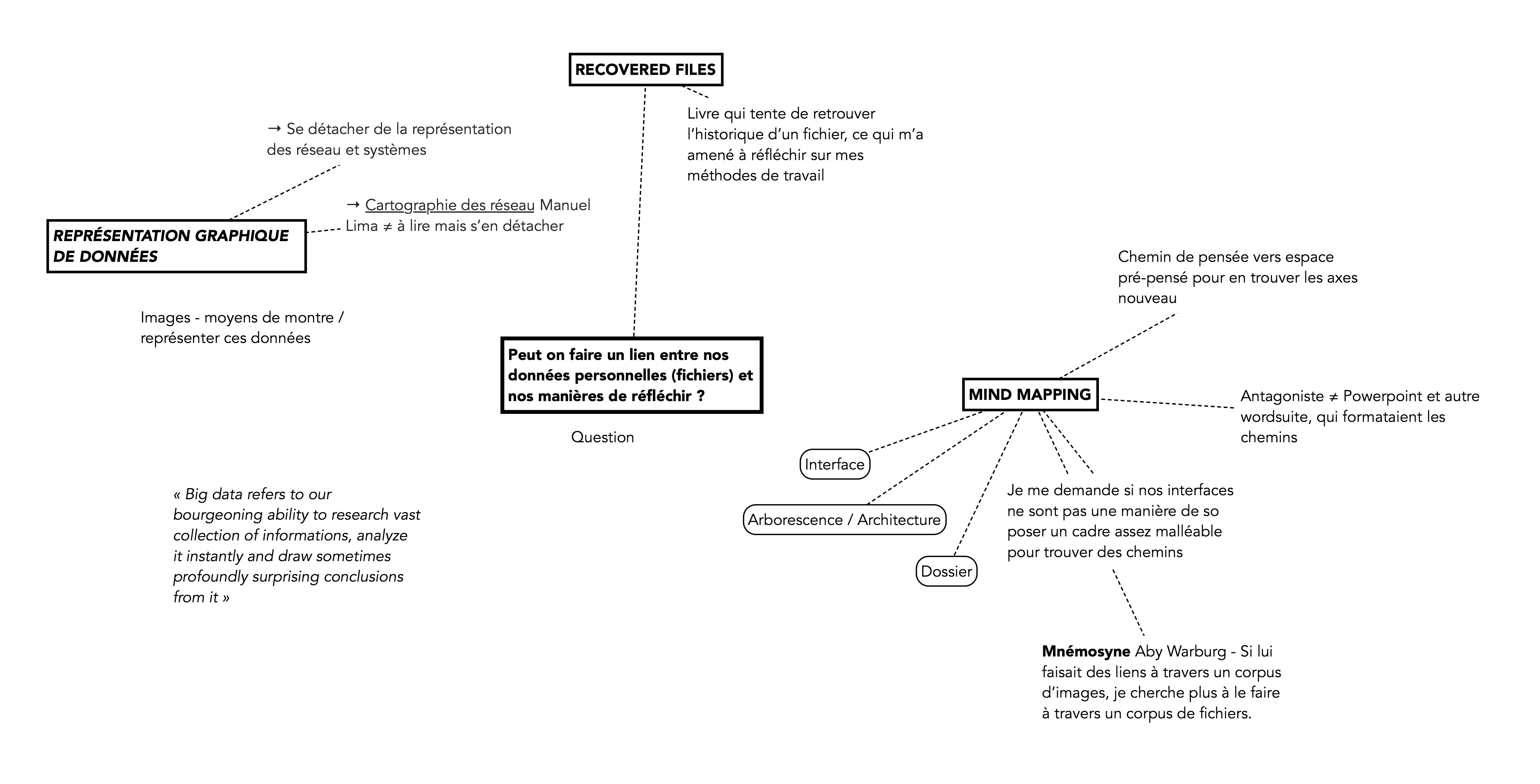 Je pense aborder ce sujets grâce à différents axes, comme la notion du mind mapping numérique (utiliser la pratique du mind mapping à travers des arborescences de fichiers / de liens / de données - Appliquer un chemin de penser à un espace pré-pensé - trouver les axes nouveaux -), de basse définition (l’ordinateur comme un médium qui uniformiserait les médias au point de tous leur donner la même valeur), — que je relierai à la pratique du copier coller —