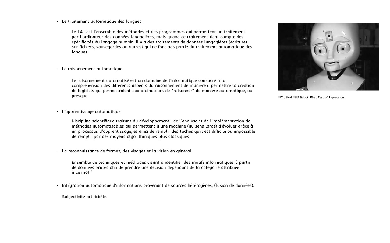 Se poser la question du statut de l'ordinateur. Pourquoi le considérer comme un révolution ? Se centrer sur ce qu’il est dans son essence. Chercher où s’arrète l’objet et où commence l’outil, l’espace, le médium. En quoi est-il un outil ? Qu’est ce qui le différencie des autres outils ? En tant qu’outil, c’est une extension corporelle augmentant nos capcités techniques. Cependant, par son utilisation, il se transforme en un support de mémoire artificiel. Il est plus qu'une extension organique liée à un usage précis, il devient, en quelque sorte, une extension de la pensée, des processus et des fonctionnements. Qu'ils soient réfléchi ou non.