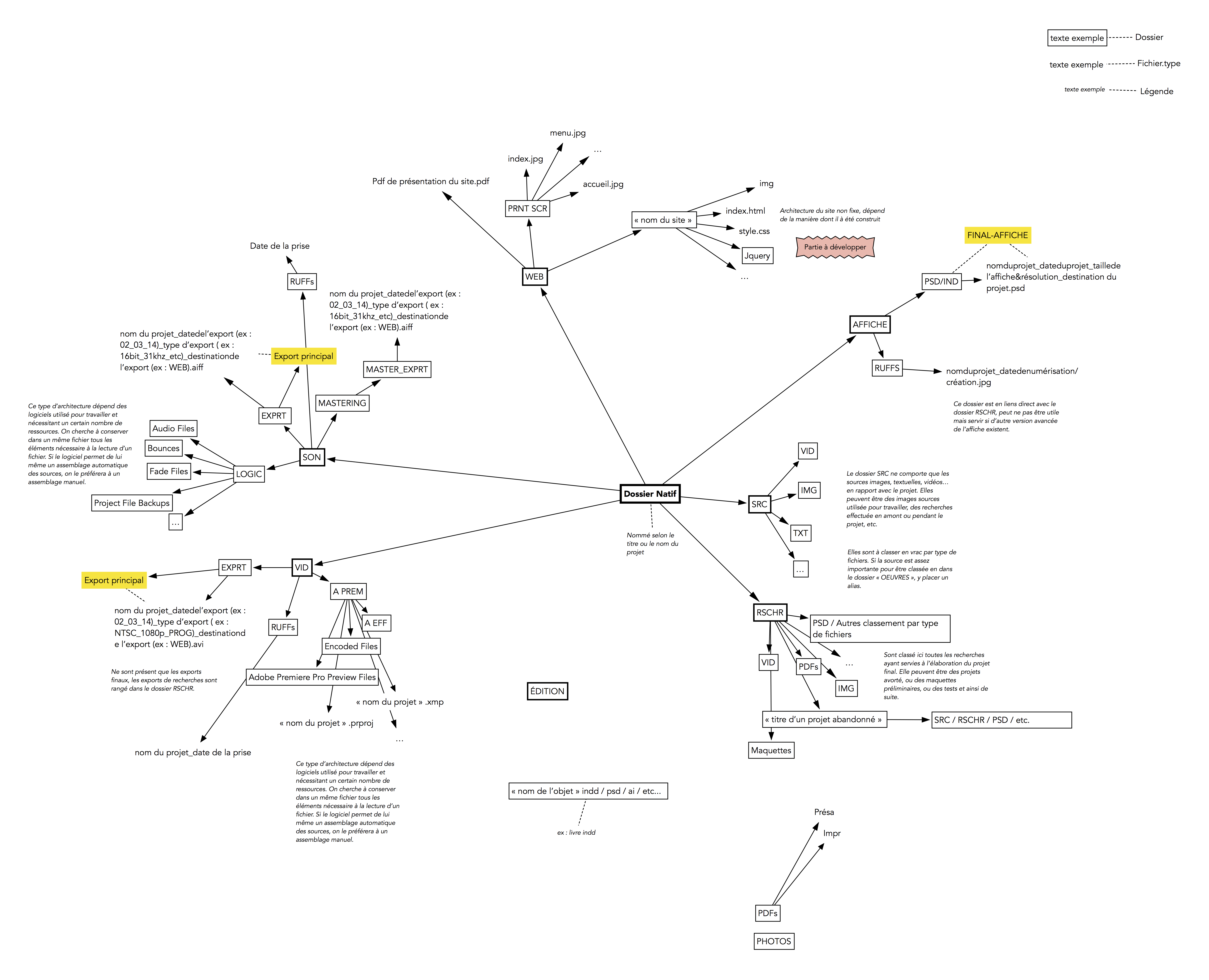 Je m'intéresse à la manière dont nous rangeons nos fichiers au sein de dossiers. C'est-à-dire que pour un projet x, nous allons usuellement créer un dossier nommé en fonction du projet dans lequel sera rangé tous les fichiers nécessaires à la création du projet. Ainsi, pour un projet fini, nous pourrions faire l'archéologie de son dossier et retrouver, grâce aux fichiers qui y sont rangés, toutes les étapes de son élaboration, de sa conception, de sa création et voir même de sa fabrication. Ce dossier et la manière dont il est rangé/organisé serait alors révélateur d'un processus de création. La manière dont la (ou les) personne(s) à l'origine du projet ont rangé tous ces fichiers serait une trace de leur processus, de leurs réflexions. Nous pourrions comparer le dossier en lui-même à une image de pensée. Partant de ce postulat, je me demande comment comprendre, analyser ces manières de ranger/d'organiser ces dossiers et fichiers pour voir quelles sont leurs influences sur nos systèmes de pensée et quelles influences ont nos ces systèmes sur eux. Voir si modifier le rangement/l'organisation transforme également les processus et donc l'élaboration du travail.