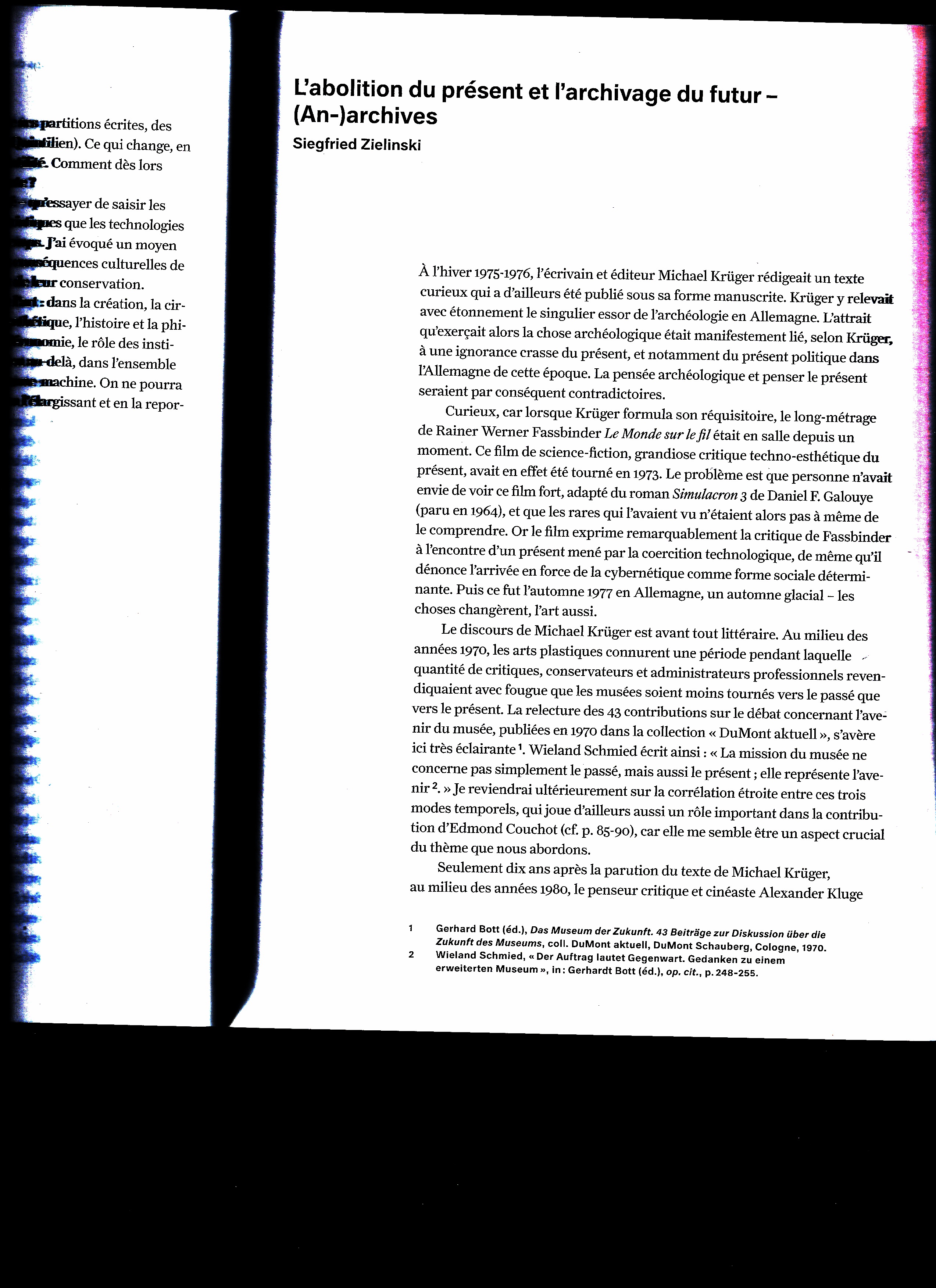 « Une migration autrement plus destructrice que le simple passage à la télévision, car elle contribue au démantèlement anarchique des programmes audiovisuels, les rendant sécables et manipulables, et met en place une esthétique de l’échantillonnage accidentel : un extrait de film par ici, un autre en version originale par là, ou encore le même film à voir en plusieurs séquences de quelques minutes... Depuis l’apparition du réseau Internet, une sensibilité à géométrie variable est en train de se mettre en place. Et la question qui se pose est celle de son incidence sur la perception du monde, de sa nature. »