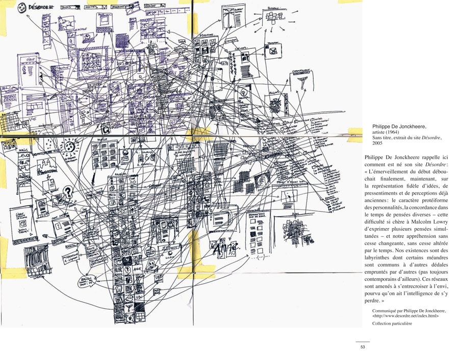 Par exemple, quand Philippe de Jonckheere travaille sur son site internet : Désordre, il établi une recherche profonde des méthodes de navigations et fonctionnement qu’aura son site, qu’il met en parallèle avec le(s) message(s) qu’il souhaite faire passer à travers son travail.